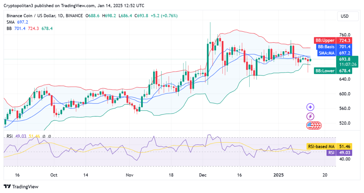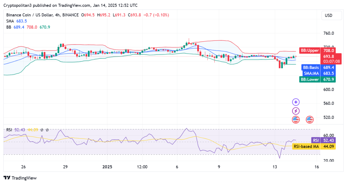 On January 14, 2025, Binance Coin demonstrated an upward trend, reaching $693.8—a 3.48% increase over 24 hours. The cryptocurrency’s price charts and technical indicators signal ongoing bullish momentum: