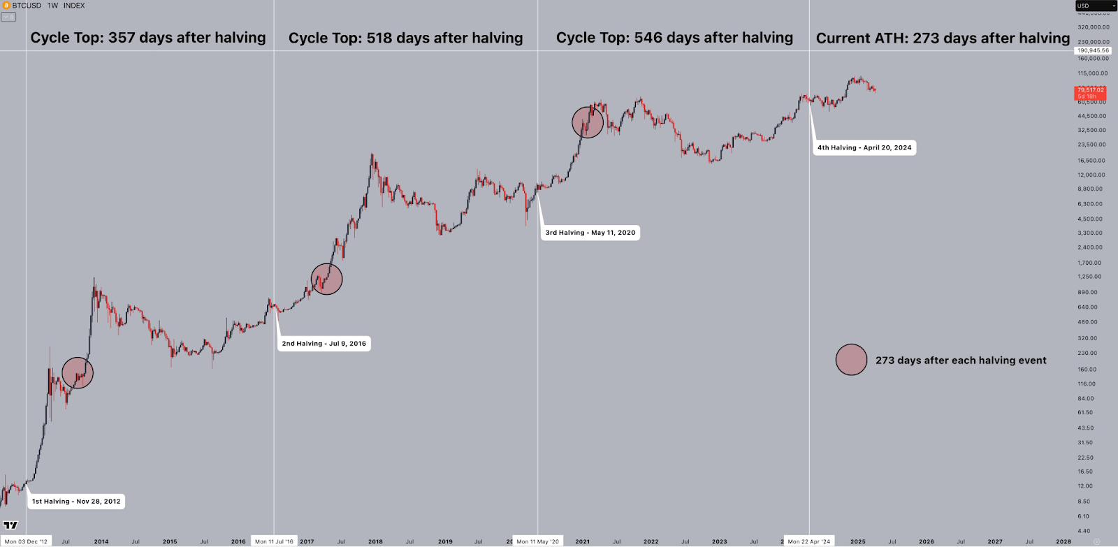Bitcoin reached a new all-time high above $109,000 on Jan. 20, 2025—just 273 days after the halving. That’s a dramatic acceleration compared to previous cycles: