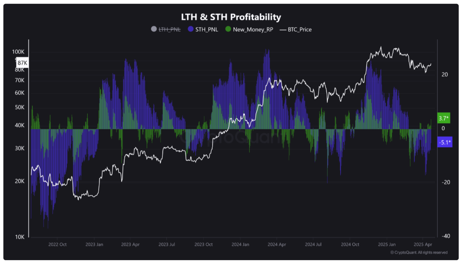 Fresh data from CryptoQuant reveals that recent buyers are already seeing 3.7% average profits, thanks to the push to $87K. This is being seen as a short-term bullish signal, suggesting reduced panic risk and growing confidence among new entrants.