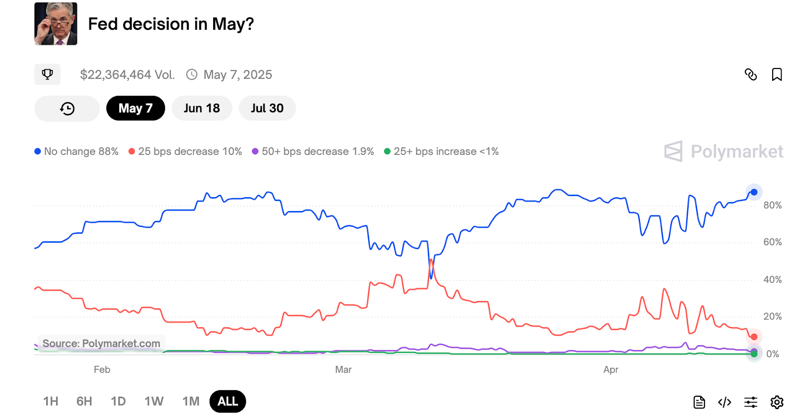 Powell’s insistence on keeping monetary policy restrictive in the face of potential inflation has weighed heavily on crypto markets. According to Polymarket, there’s now an 88% chance interest rates will remain between 4.25% and 4.50%, and only a 10% chance of a cut.