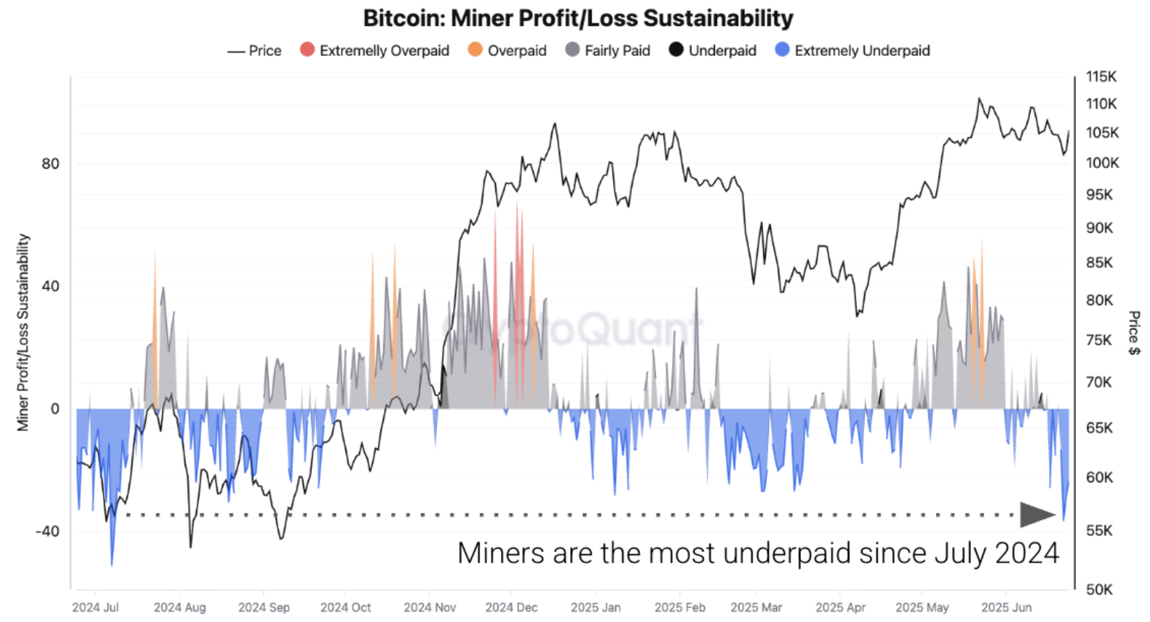 “Bitcoin miners are the most underpaid they have been in the last year,” the report notes, citing declining transaction fees and the recent price pullback as key factors.
