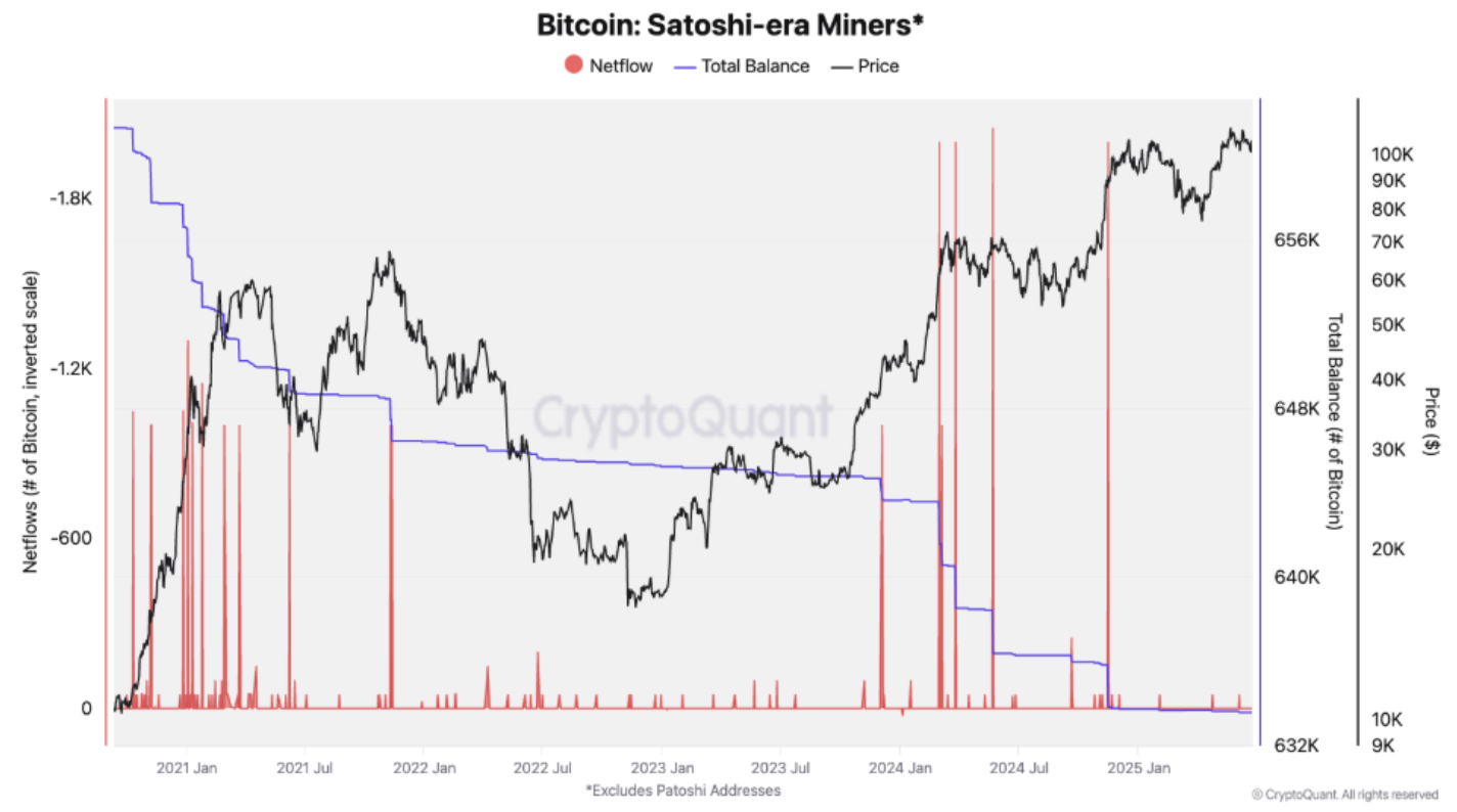Satoshi-era miners offload only 150 BTC in 2025 as institutional-style hodling dominates the market.