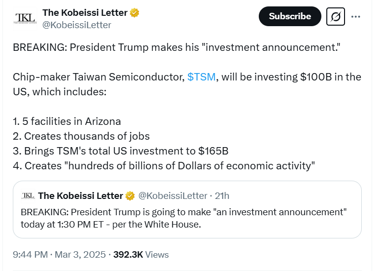 During the same speech, Trump also made a major investment announcement, which included a $100 billion investment by Taiwan Semiconductor (TSMC) in the U.S., a move expected to have major implications for both the tech and crypto industries.