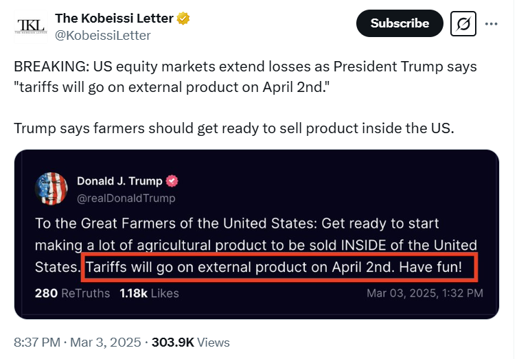 On March 3, President Trump signed a tariff agreement that raised the existing 10% import tariff on China to 20%. Additionally, the U.S. will impose 25% tariffs on goods from Canada and Mexico, effective March 4.