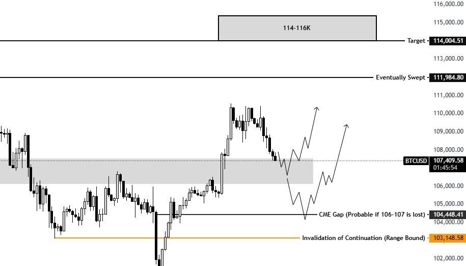 “Bitcoin rejected local supply & is now pushing into demand around 106–107K,” said trader Killa. “This is a crucial level in terms of market structure.”