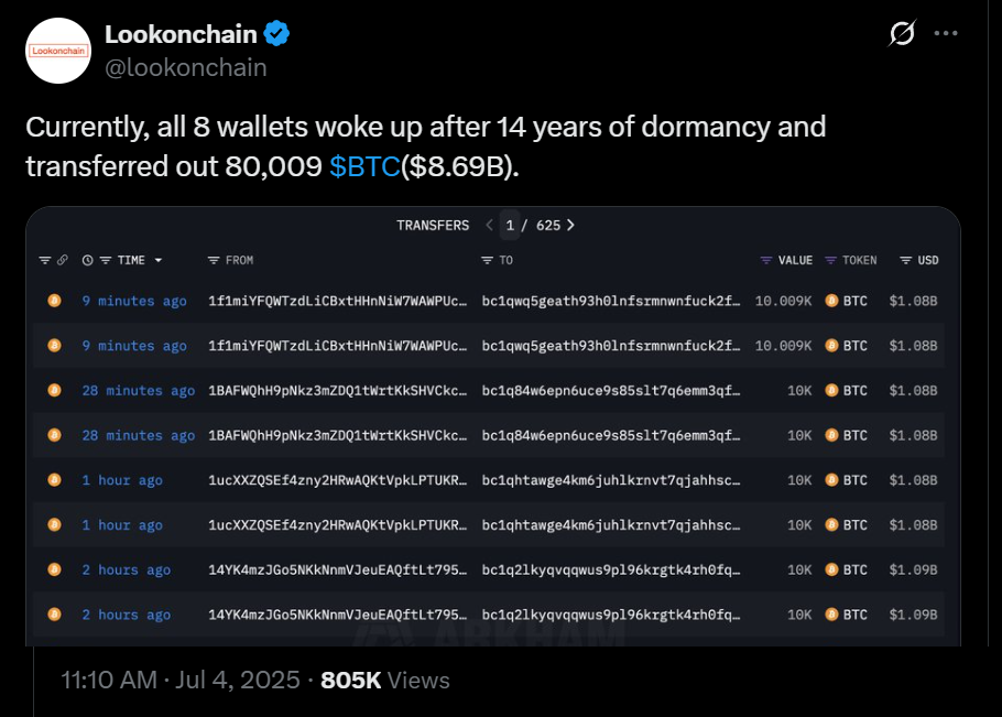 Fueling Friday’s sell-off was the sudden reactivation of a long-dormant Bitcoin wallet, reportedly controlled by a 2011-era miner. Roughly 80,009 BTC, worth over $8.5 billion, moved onchain in a flurry of transactions across eight addresses.