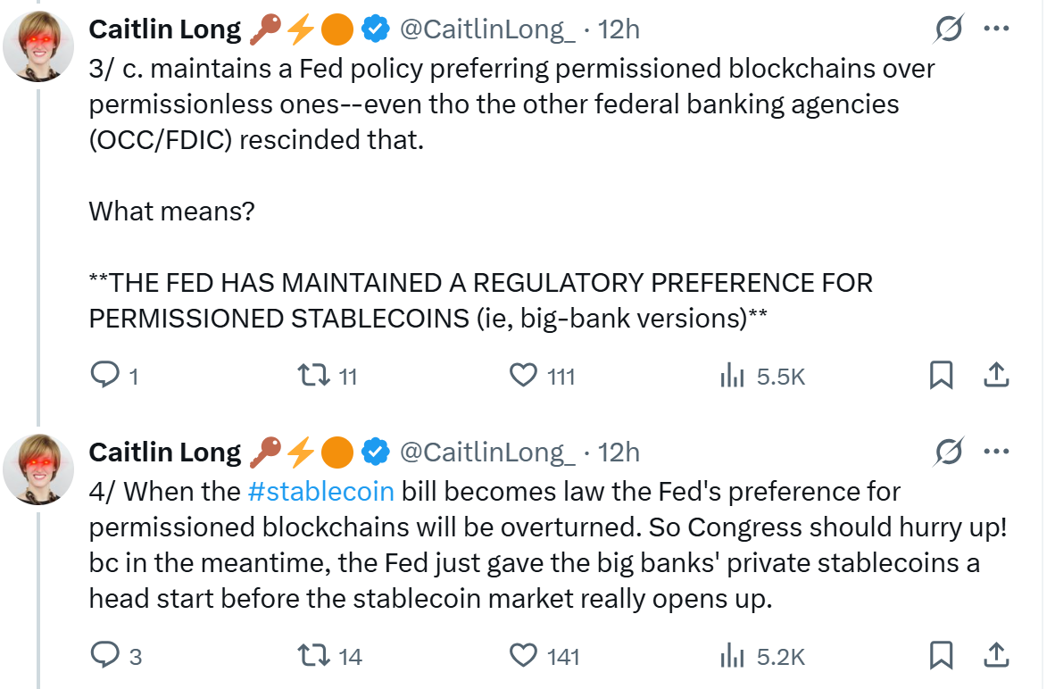 Caitlin Long criticizing the Fed’s preference for permissioned stablecoins. Source: Caitlin Long