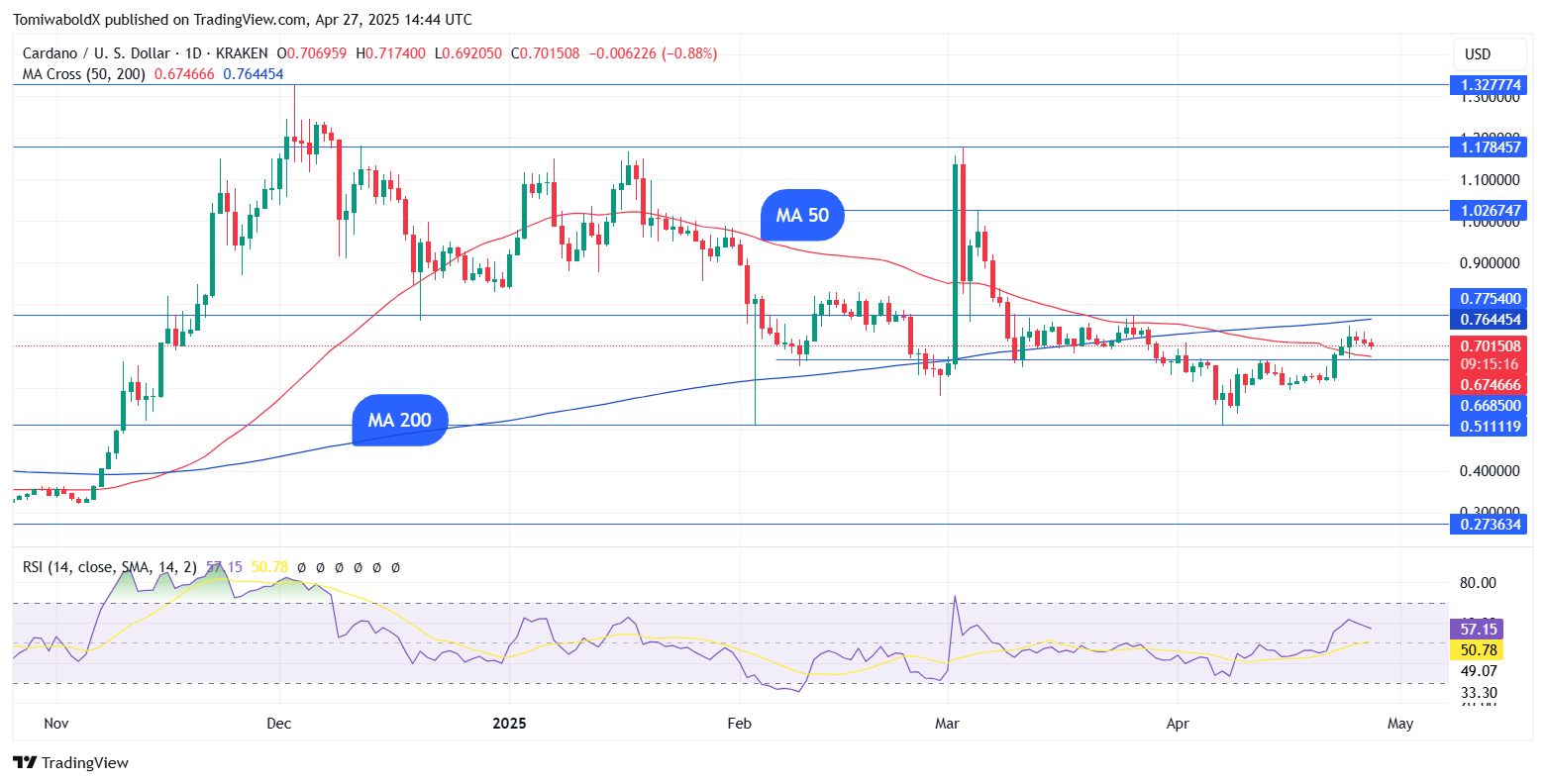 Despite the market pullback, Cardano bulls have successfully defended the psychological $0.70 level, which has proven to be a strong support zone. This price point is especially important, as it lies between the daily 50-day SMA ($0.674) and the 200-day SMA ($0.764), making it a crucial battleground for bulls and bears alike. The ability to hold above $0.70 signals that buyers are still in control, preventing a deeper price correction, at least for now.