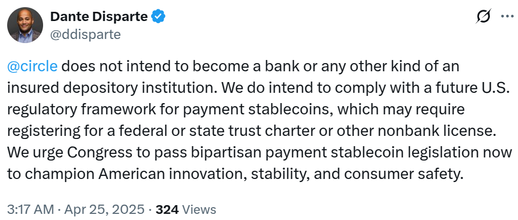 In a direct and public response on X (formerly Twitter), Dante Disparte, Circle’s Chief Strategy Officer and Head of Global Policy, stated that the company is not pursuing a U.S. bank charter or attempting to acquire an insured depository institution.