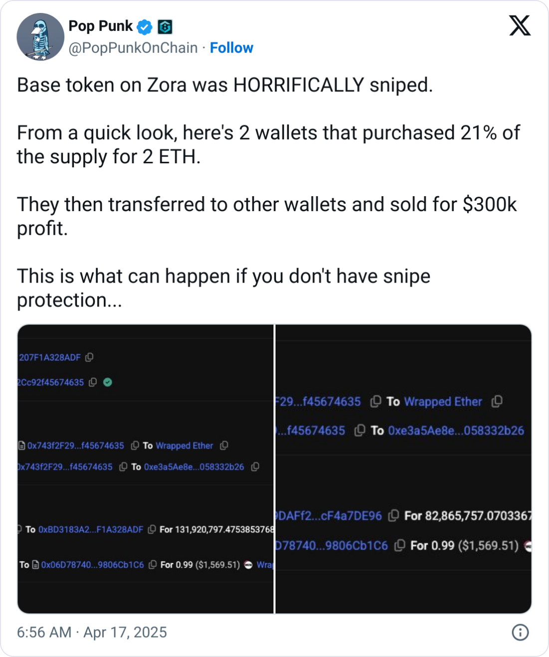 According to Harrison Leggio, co-founder of crypto startup g8keep, two wallets quickly bought up 21% of the token’s supply for just 2 ETH (approx. $3,200) — flipping it for over $300,000 in profits. He called the incident “HORRIFICALLY sniped.”