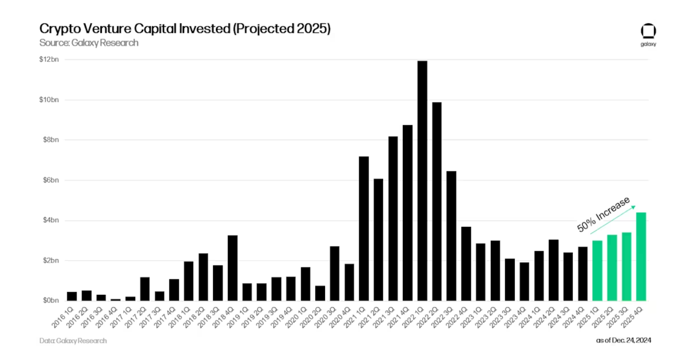 - 2025 Outlook: VC investments are expected to grow 50% year-over-year, reaching $18 billion, according to PitchBook and Galaxy Digital.