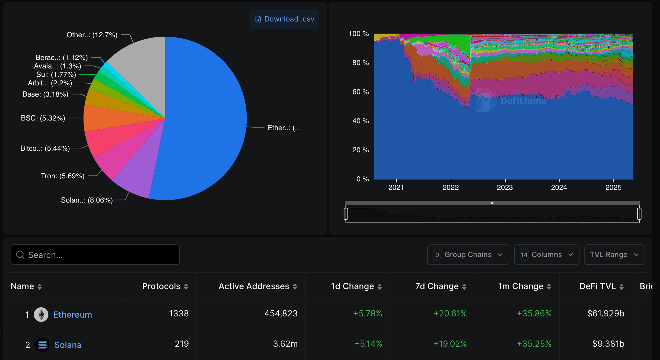 According to DefiLlama, Ethereum continues to dominate decentralized finance (DeFi), commanding between 50%–60% of all total value locked (TVL) since May 2022. As of May 14, the network’s TVL is nearly $80 billion, underscoring the scale of value at stake.