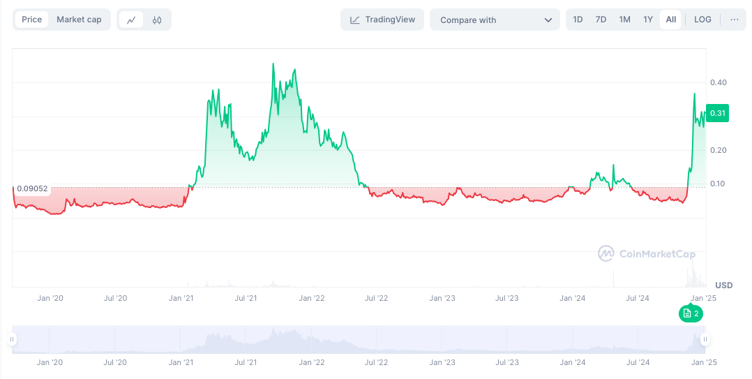 - 2021: The coin experienced a bull run, peaking at $0.5701 in September.