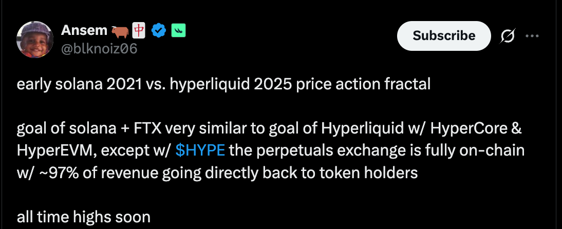 Ansem believes that such strong fundamentals, paired with a familiar price trajectory, could push HYPE toward all-time highs. Traders, especially those with memories of Solana’s meteoric rise, may feel this setup is too familiar to ignore.