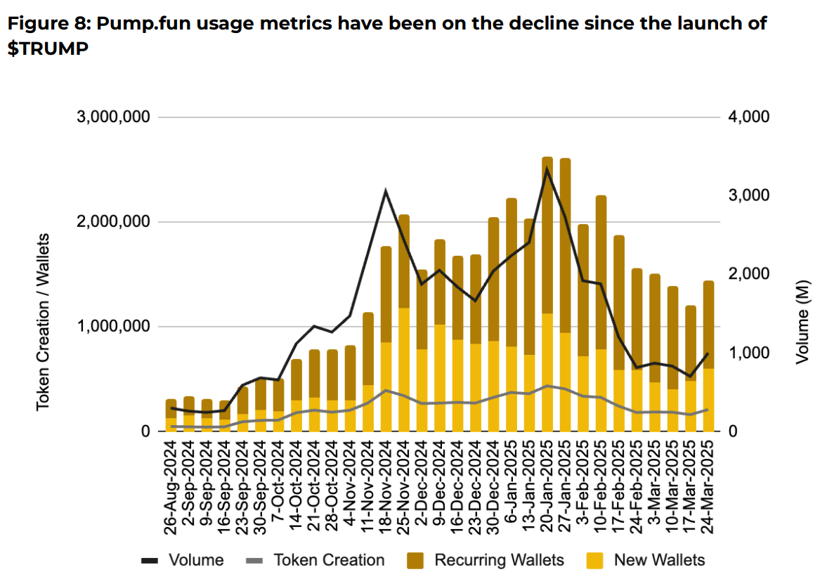 Meanwhile, the broader memecoin market shows signs of cooling. Pump.fun, a leading memecoin launchpad, saw weekly active wallets drop from 2.85 million in mid-January to 1.44 million by March 31, signaling a potential end to the memecoin supercycle.