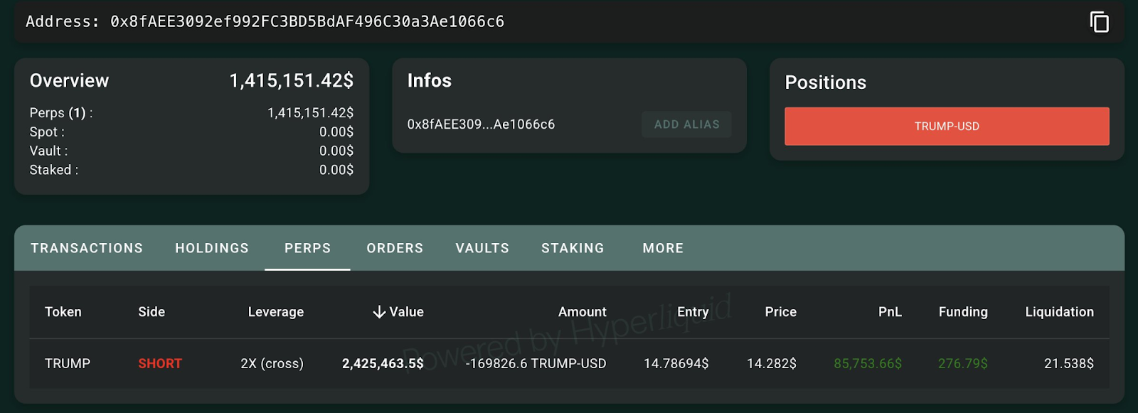 In a related development, a whale investor opened a $1.33 million short position against the Official Trump (TRUMP) memecoin, depositing USDC stablecoins with 2x leverage at $14.7, according to Lookonchain. This position risks liquidation if TRUMP’s price exceeds $21.50, reflecting the high-stakes speculation surrounding Trump-linked tokens.