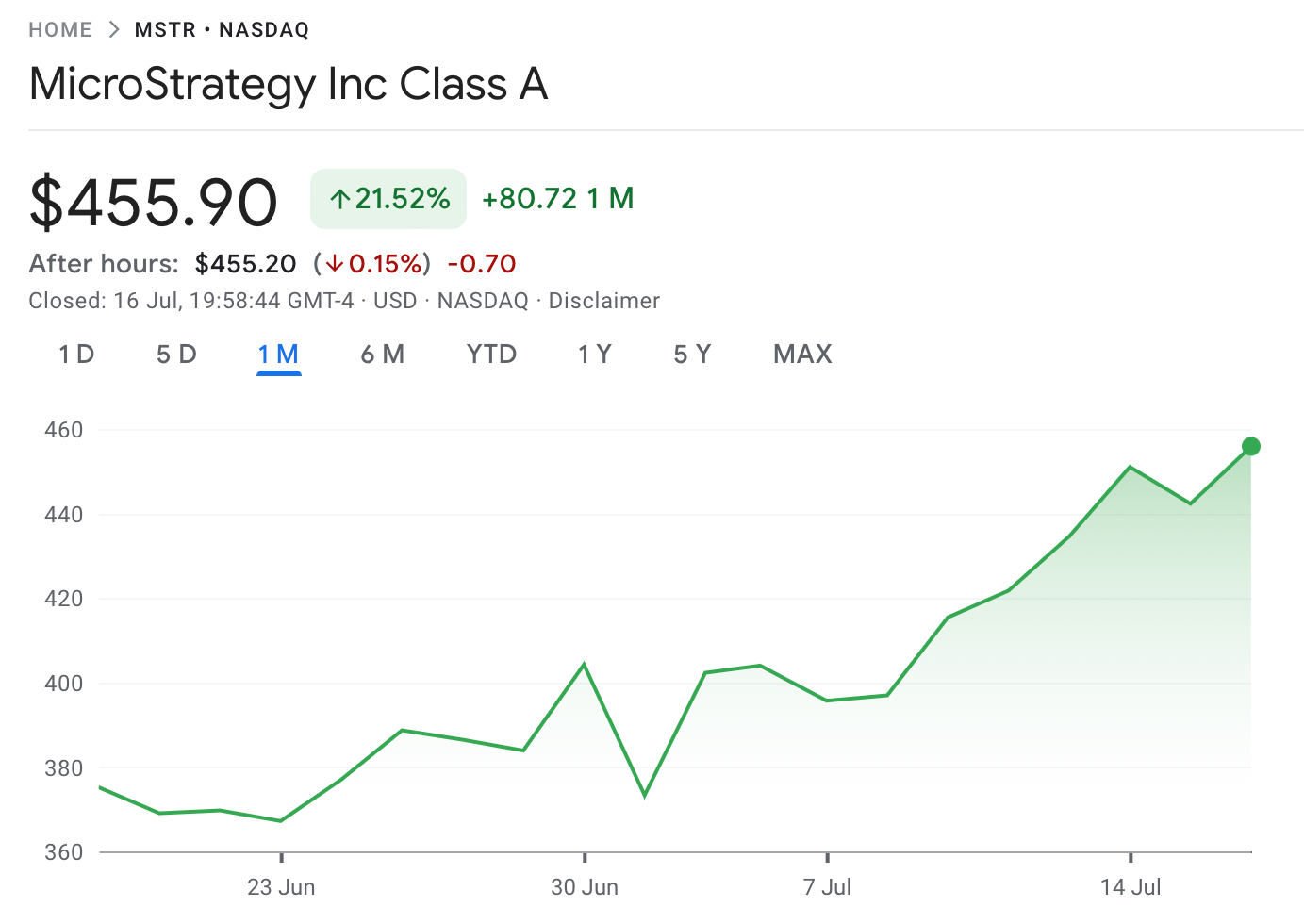 MicroStrategy’s stock finished the day at $455.90, marking a 21.52% increase over the past month, according to Google Finance data.