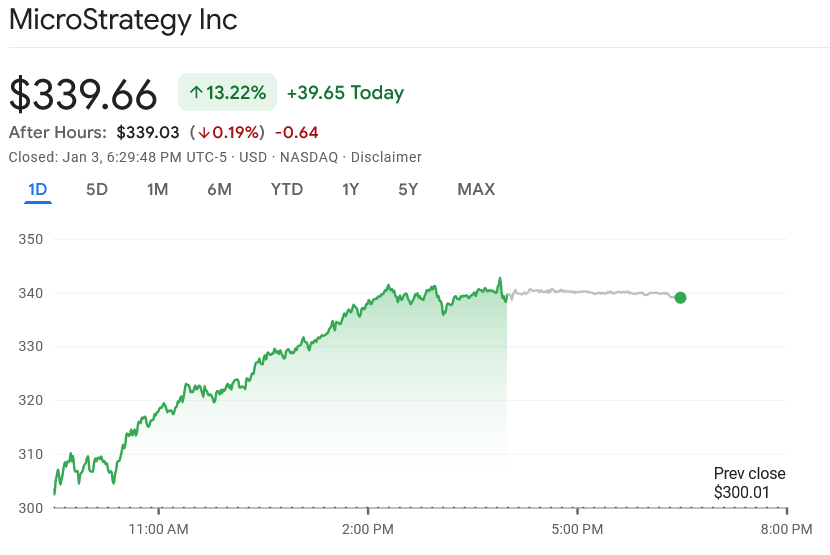 The company’s Bitcoin investment strategy, spearheaded by Executive Chairman Michael Saylor, has redefined corporate Bitcoin adoption. It has also driven a 13.2% increase in MicroStrategy shares on January 3, now priced at $339.60—a staggering 438% rise year-over-year.