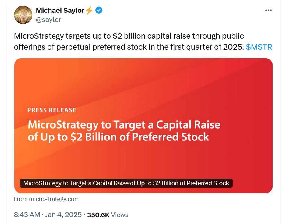The offering, announced on January 3, would allow MicroStrategy to issue perpetual preferred stock convertible into class A common stock, payable via cash dividends, share redemption, or a combination of methods. However, the company emphasized that market conditions will dictate whether the offering proceeds.
