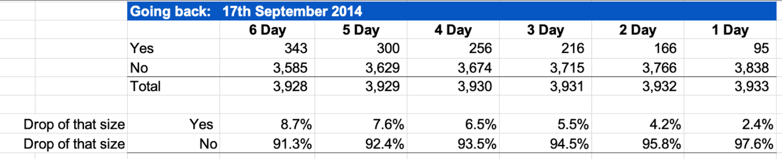“Going back to September 17, 2014, there have been 3,928 six-day periods,” Walton explained. “In just 343 of those, Bitcoin dropped more than 10% — that’s 8.7%. The rest, 91%, stayed within range.”