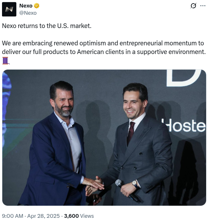 Nexo Returns to the U.S. Market as Trump Jr. Highlights Crypto’s Future Amid New SEC Leadership