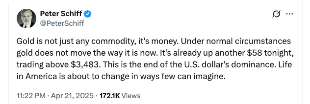 Schiff’s remarks came shortly after gold futures hit an all-time high of $3,500, with spot gold reaching $3,498 on April 22, according to TradingView. As gold prices surge, Schiff has raised alarms about the US dollar’s dominance and its future outlook. In a post on X (formerly Twitter), he stated, “This is the end of the US dollar’s dominance. Life in America is about to change in ways few can imagine.”