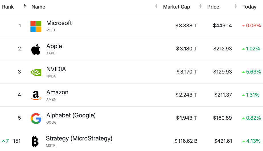 Strategy (MSTR) stock against the top five stocks globally by market capitalization. Source: CompaniesMarketCap