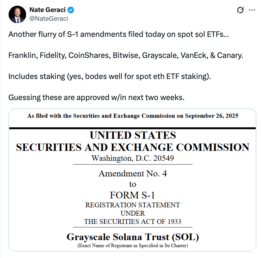 Several Solana exchange-traded fund (ETF) applications featuring staking could receive U.S. approval by mid-October, according to ETF analyst Nate Geraci.