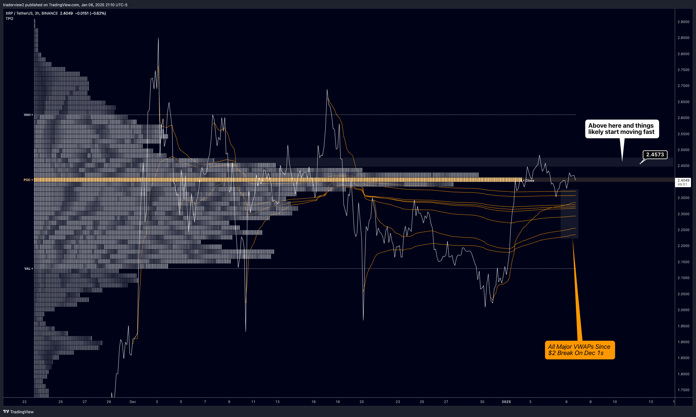 Order flow analyst Dom adds further insights, noting that XRP has remained in a mid-range consolidation for six weeks, with a point of control (POC) around $2.45 based on the Volume Weighted Average Price (VWAP). He explains: